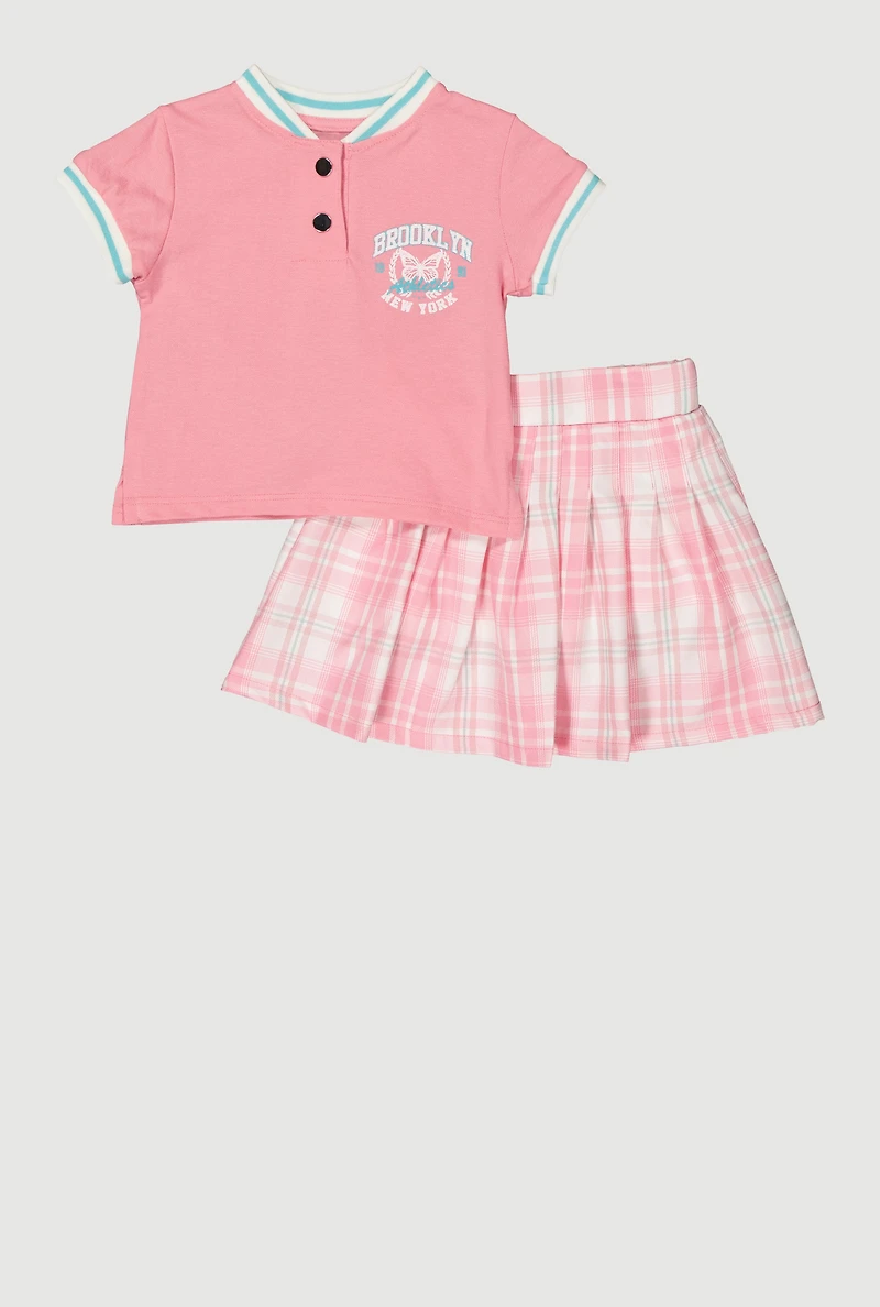 Little Girls Brooklyn New York Graphic Tee and Plaid Skort