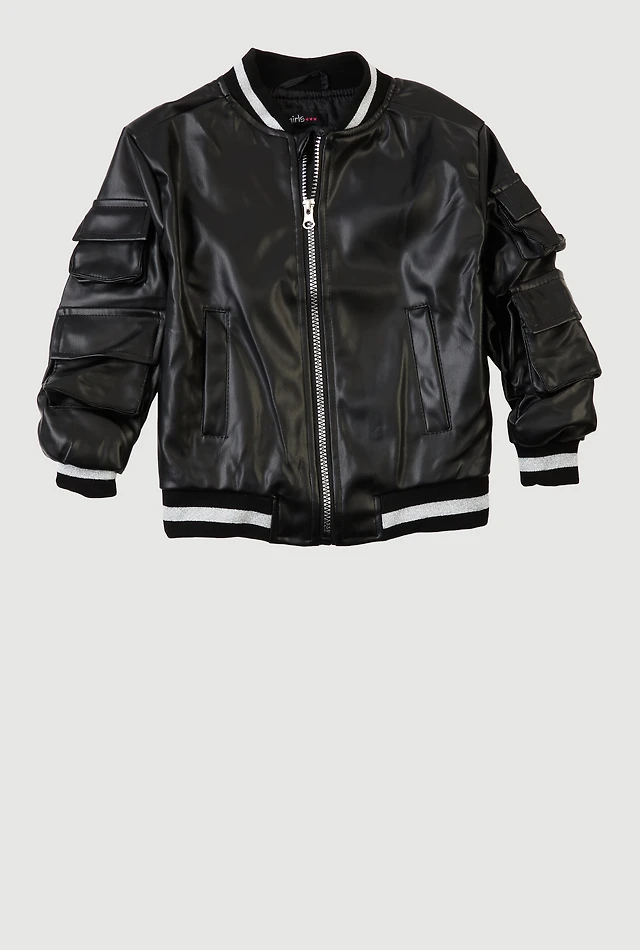 Little Girls Faux Leather Cargo Pocket Bomber Jacket, Black, Size 5-6