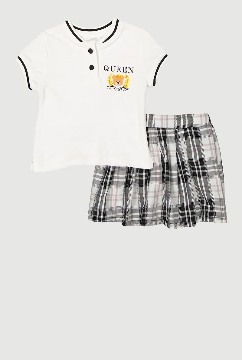 Little Girls Queen Of Everything Graphic Tee and Plaid Skort