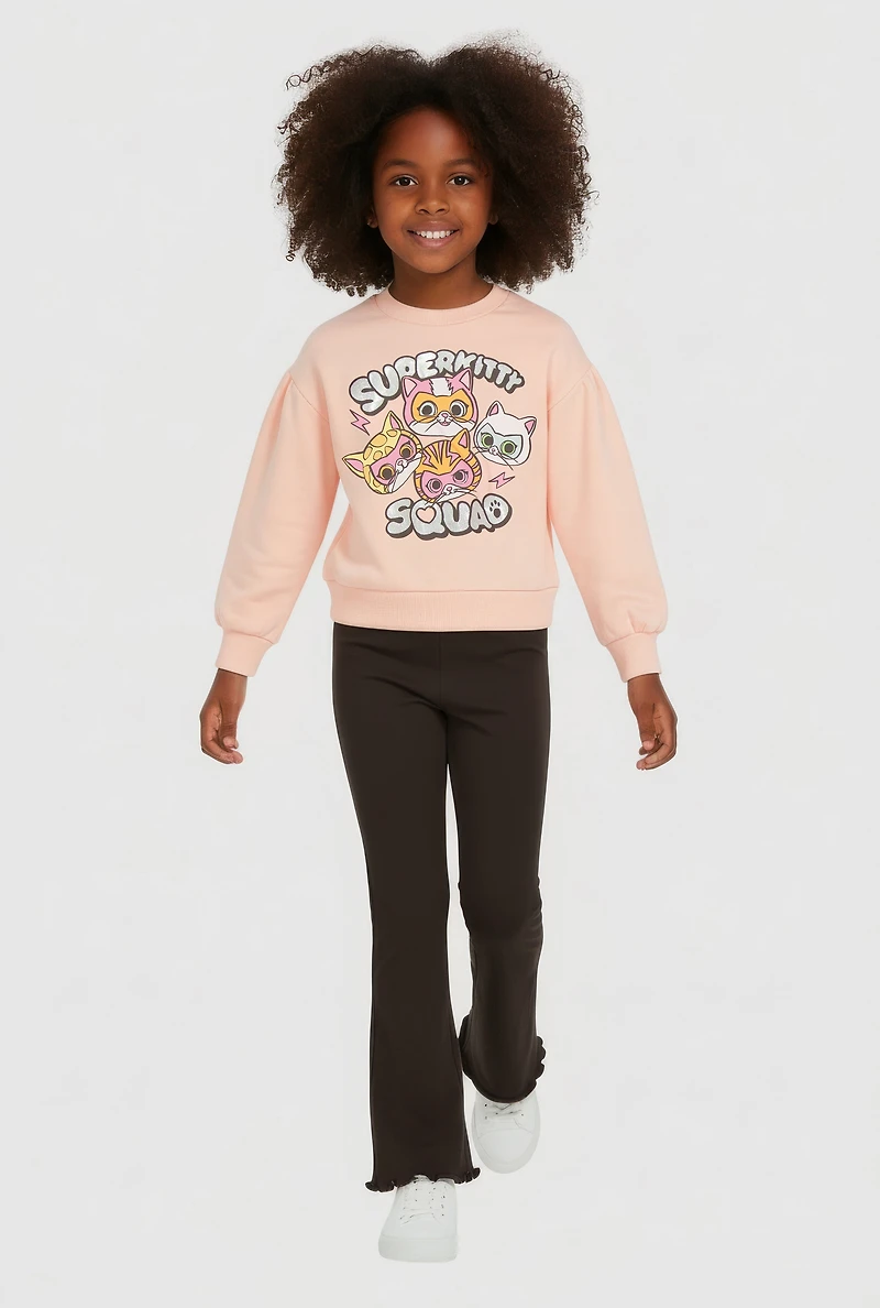 Get ready for cozy days and playful adventures with this Little Girls Superkitty Squad Graphic Sweatshirt and Leggings set. Featuring a fun and vibrant graphic print inspired by Disney's Superkitties, this two-piece set combines comfort and style effortlessly. The fleece fabric keeps her warm while the balloon long sleeves and crew neck add a trendy twist to classic casual wear. Perfect for everyday fun or lounging around, this mid-rise flare leggings and pullover sweatshirt duo is a must-have for your little fashionista's wardrobe.