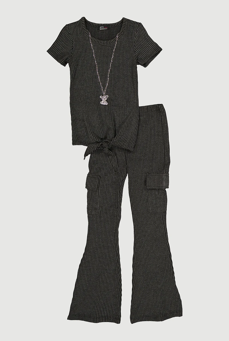 Little Girls Textured Rib Knit Top with Necklace and Flare Pants