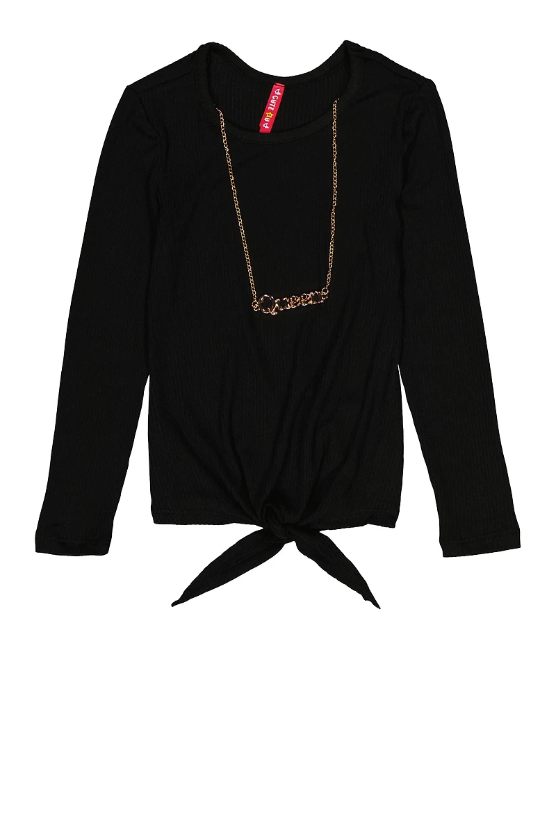 Little Girls Tie Front Top with Graphic Chain Necklace