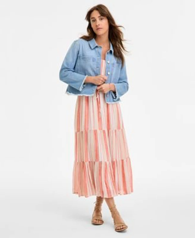 Liverpool Los Angeles Womens Striped Denim Cropped Shacket Flutter Sleeve Maxi Dress