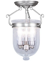 The Jefferson Semi Flush light by Livex offers a classic silhouette with traditional details. A trio of lights is nestled in the handblown seeded glass bell jar and accented by brushed nickel-tone details.
