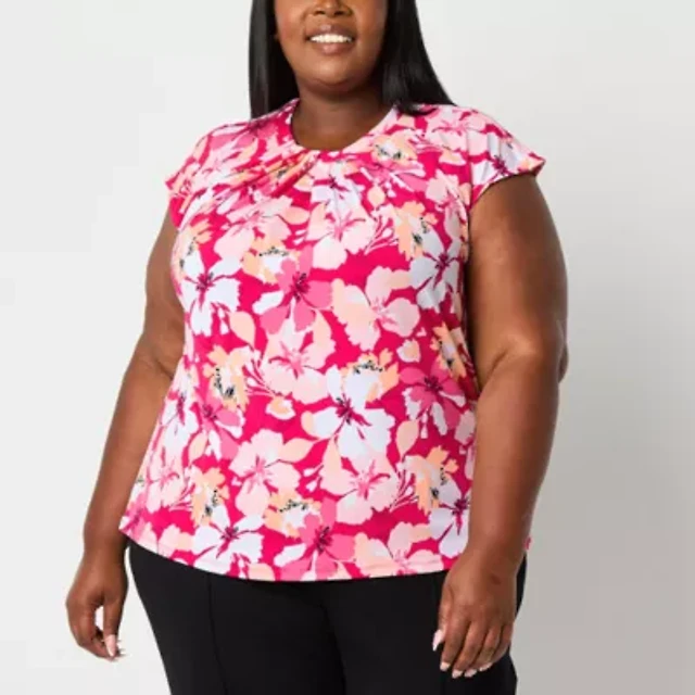 Liz Claiborne Womens Plus Split Crew Neck Short Sleeve Blouse