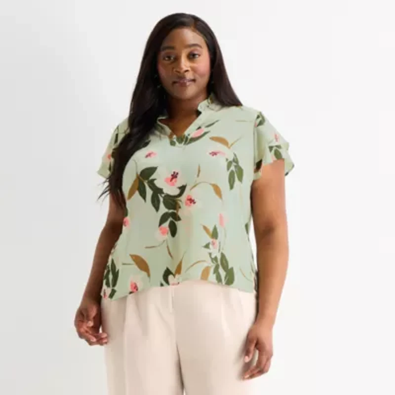 This Liz Claiborne women's plus blouse has a fresh floral pattern you will love wearing to a work event or a dinner date. Made from soft recycled georgette, this top has a split crew neck with a high ruffled trim, short flutter sleeves and a relaxed flowy fit - making it an effortless pairing with white jeans or capri pants.