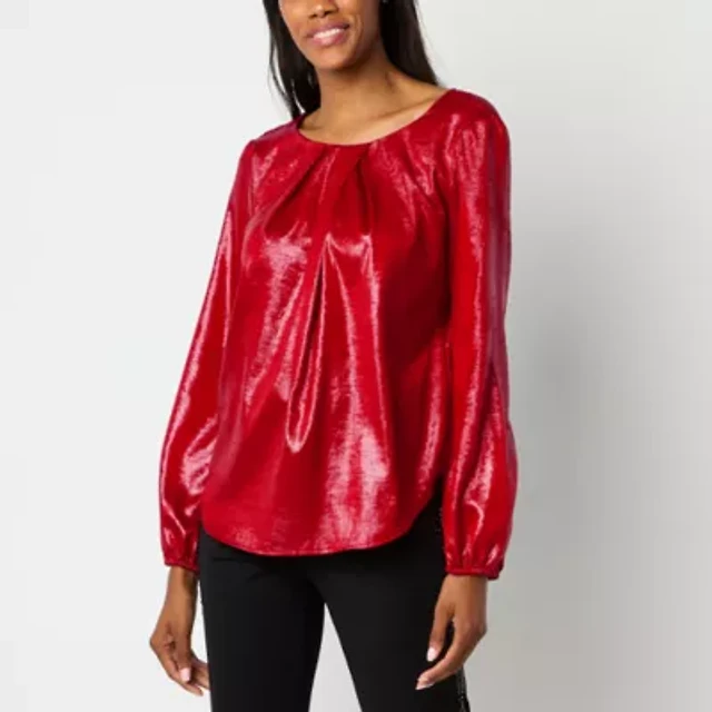 Liz Claiborne Womens Round Neck Long Sleeve Satin Blouse