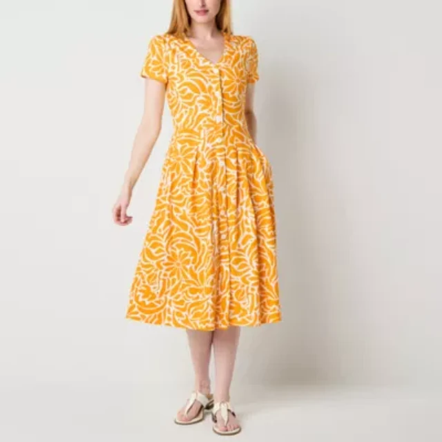 Liz Claiborne Womens Short Sleeve Midi Floral A-Line Dress