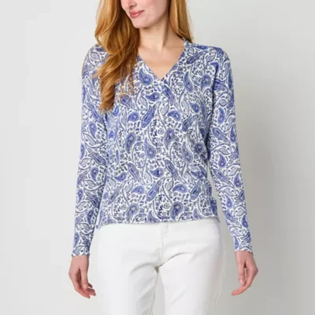 Liz Claiborne Womens V Neck Long Sleeve Paisley Pullover Sweater