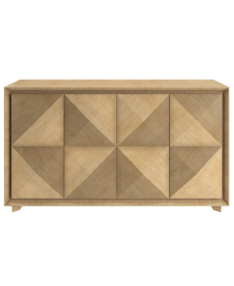 Shut the front door-literally-and do it with a satisfied sigh. This buffet commands attention with its bold pyramid-shaped panels, accented by delicate micro-grooved textures that play with light and shadow. Four doors form a striking checkerboard pattern, turning function into a tactile celebration of style and craftsmanship. Each door features sleek European soft-close hinges, ensuring every close feels as smooth and luxurious as the design itself. A true statement piece for those who know the difference between ordinary and extraordinary.