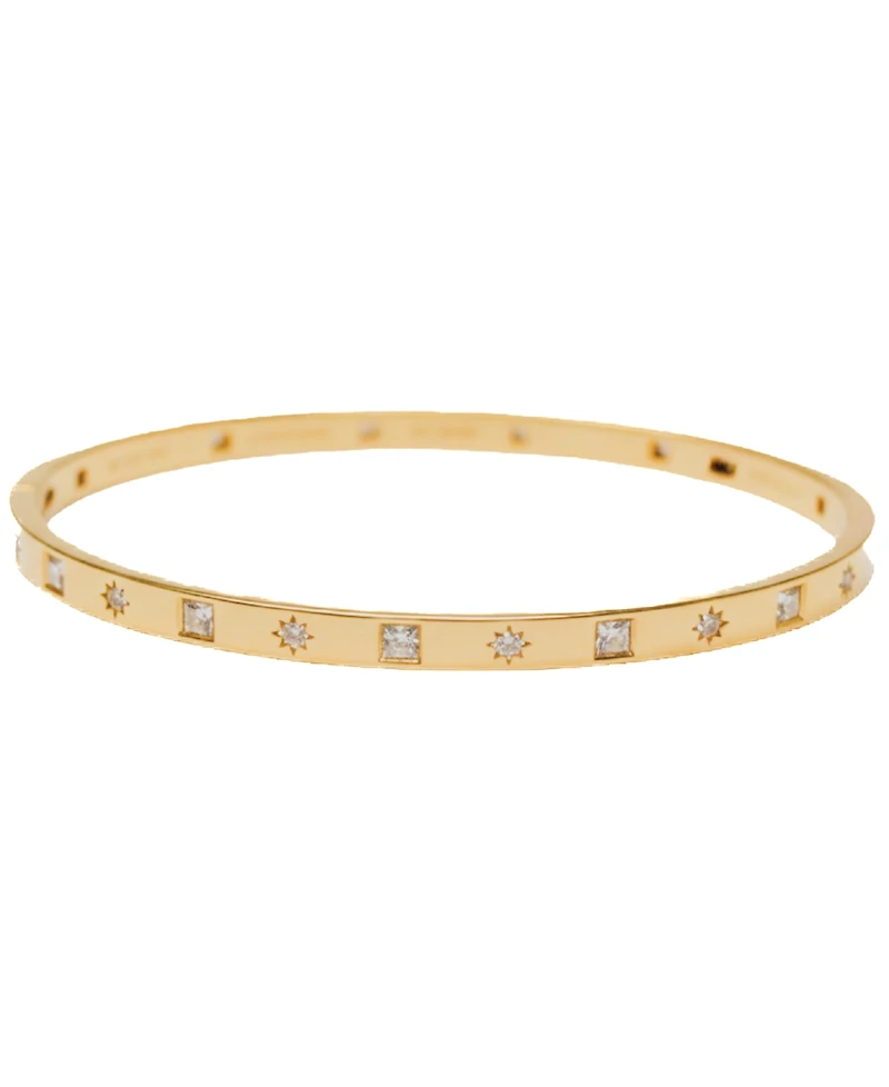 The Stella Bangle is a celestial-inspired gold piece featuring starburst and square Cz accents, blending radiant elegance with timeless charm. Crafted from stainless steel with an 18K gold plated finish, it's hypoallergenic, durable, and perfect for stacking or wearing solo.