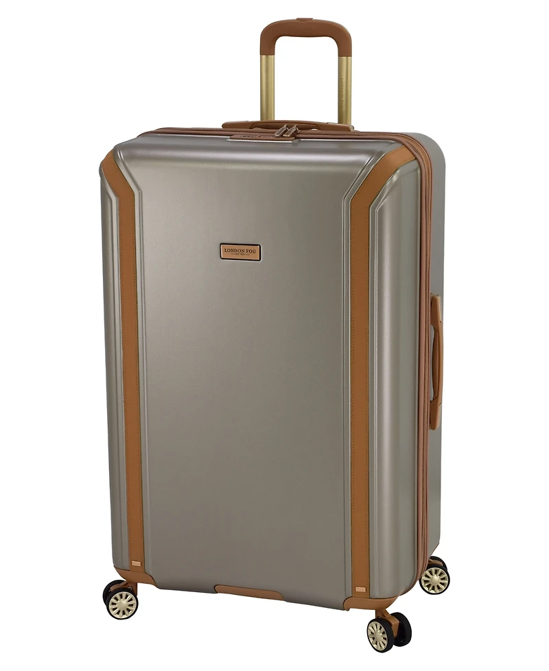 The London Fog regent 31.5"" expandable spinner is made in a durable polycarbonate alloy hard side construction with a leather inlay trim. There are 8 recessed spinner wheels that make traveling smooth. Interior has zippered lid compartment, mesh pocket and mesh packing cradle to keep your belongings organized. There are Tpr (thermoplastic rubber) cushion grips on top and side carry handles and a bottom grip handle on all sizes. Spinners expand 2"" for additional packing capacity. Industrial zippers are self repairing.