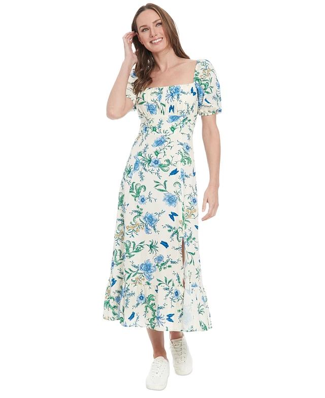 London Times Petite Linen-Blend Floral-Print Maxi Dress