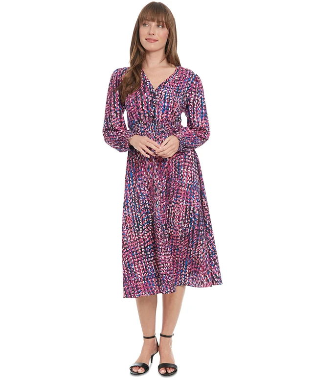 London Times Women's Ruffle Neck Smocked Waist Dress