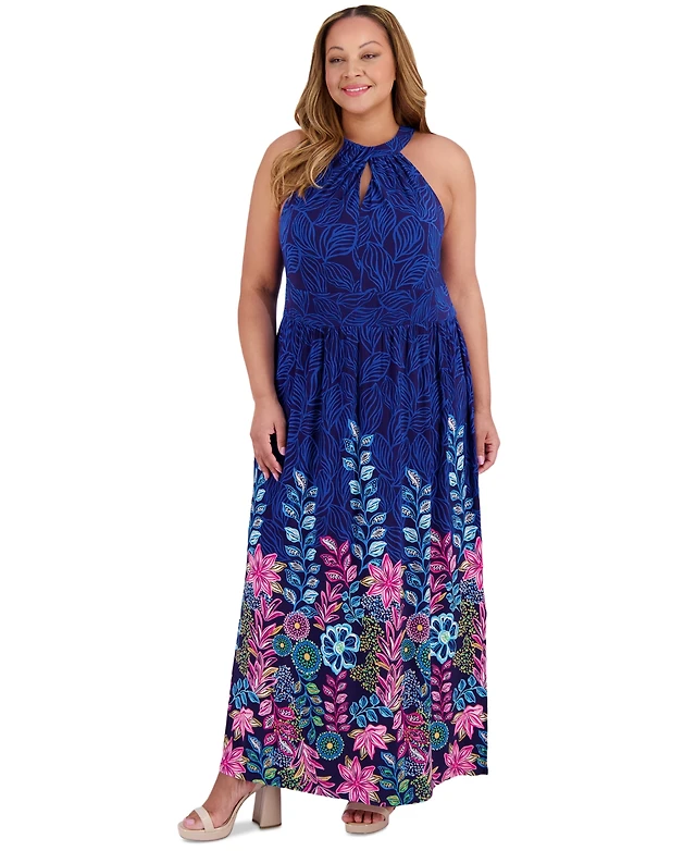 London Times Plus Size Floral-Print Halter Maxi Dress