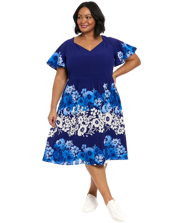 London Times Plus Placed-Floral Flutter-Sleeve Dress