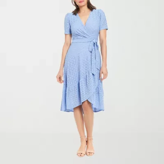 London Times Womens Short Sleeve Eyelet Midi Fit + Flare Dress