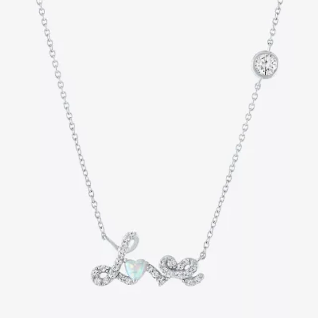 "Love" Womens Lab Created White Opal Sterling Silver Heart 17 Inch Pendant Necklace