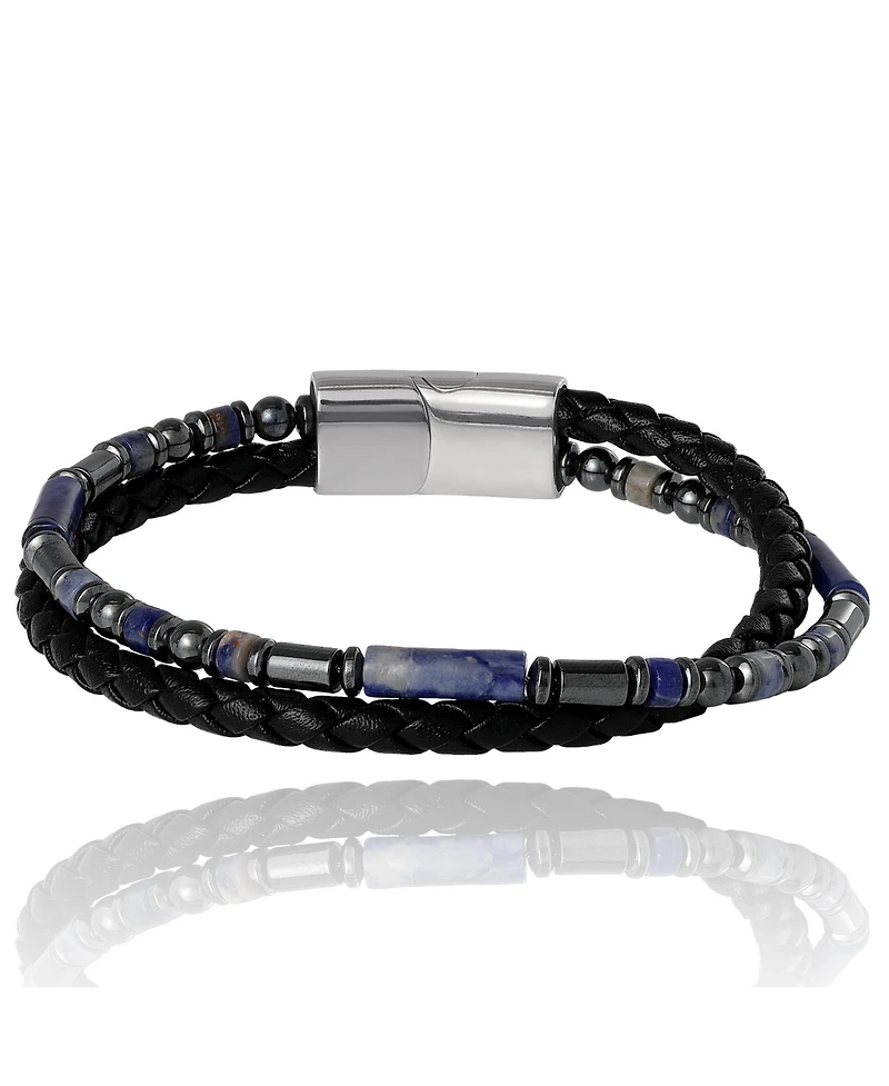 Blue stone meets black leather. This two row bracelet combines a braided leather band with a strand of sodalite style tube and round beads plus hematite accents. A strong magnetic clasp makes on/off a snap.