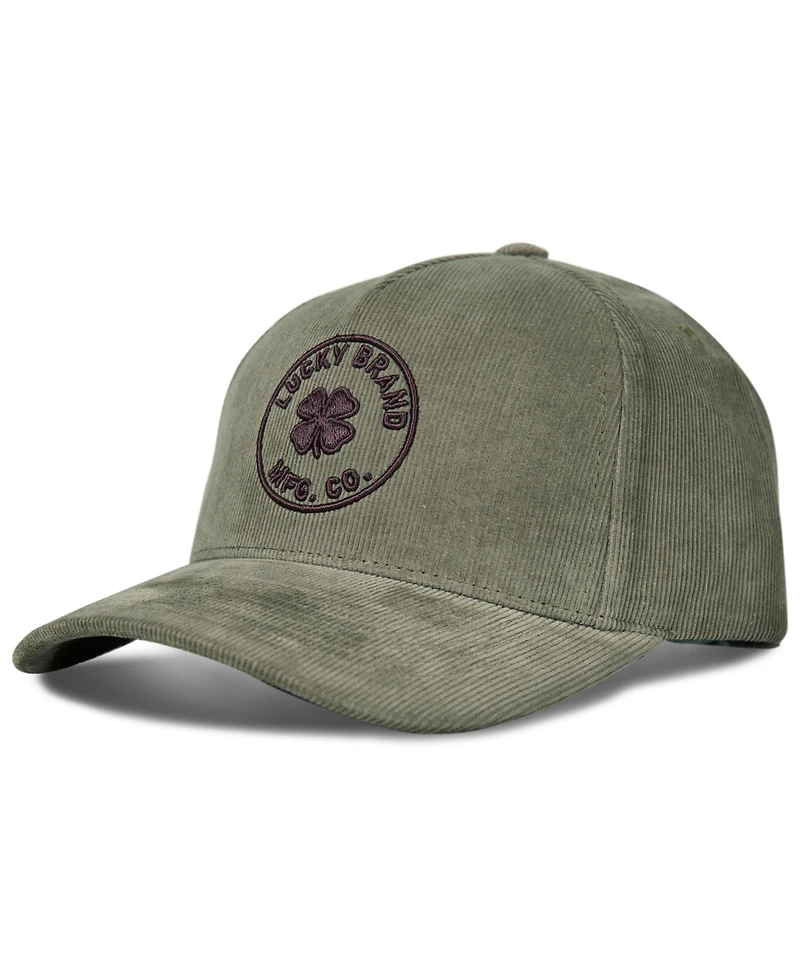 Lucky Brand Mfg Co. embroidered cord hat is crafted from polyester corduroy and features a semi-structured mid-profile crown, semi-curved bill, embroidered logo applique on the front, comfort fit sweatband, and adjustable closure with a brass finish metal clip. One size fits most.