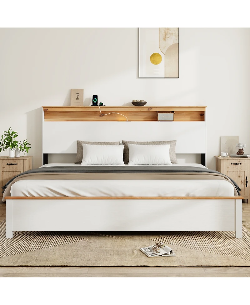 This bed frame combines bedroom style with practical everyday function. Features farmhouse style, storage headboard, charging station, and Led lights. Built with noise-free support, metal slat support, and wood slat support for dependable everyday performance.