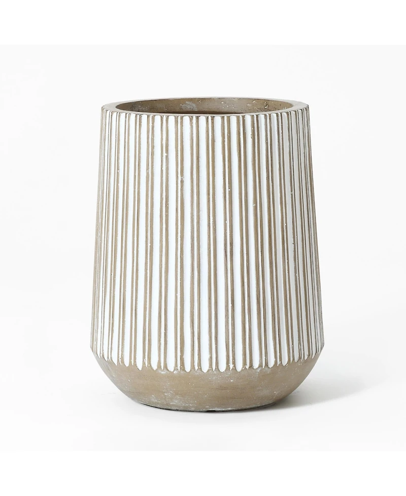This contemporary-striped planter is the perfect addition to your home! Its unique brown and white design, flared base, and tapered top are sure to catch the eye of anyone who passes by. Whether you choose to place it indoors or outdoors, it will complement and enhance the beauty of its surroundings. Made from durable magnesium oxide, this weather and Uv-resistant planter is built to last. The tall, round pot comes with a drainage hole to prevent over-watering, promote plant health, and encourage healthy growth and a drainage plug for convenience. It's a beautifully hand-crafted planter that is perfect for your houseplants, exotic tropical foliage, colorful flowers, or faux plants. Add a touch of elegance to your garden today with this exquisite planter!