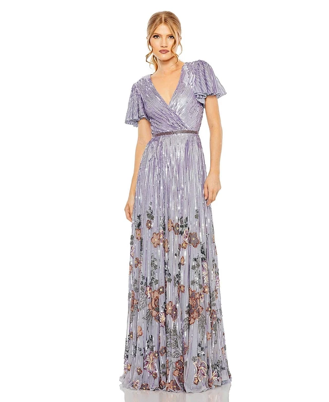 Mac Duggal Women's V Neck Flounce Sleeve Embellished Mesh Gown