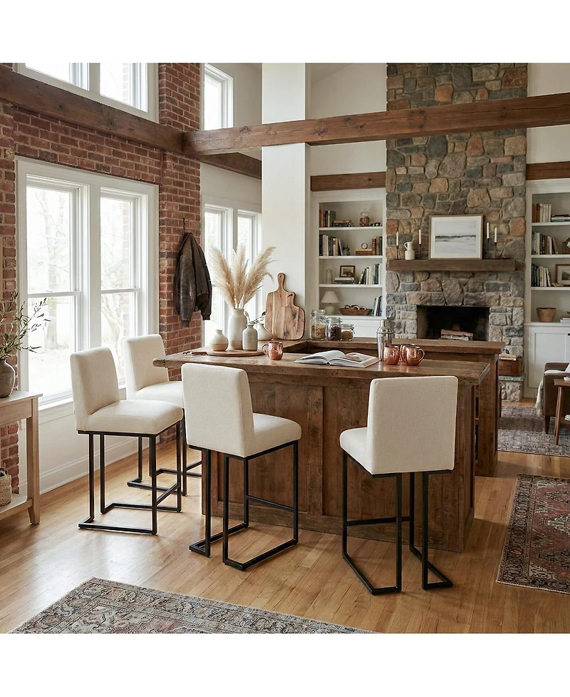Upgrade kitchen island seating with this set of 4 fabric counter height stools designed for everyday meals and casual entertaining. Premium upholstered fabric adds a tailored, high-end feel, while the padded seat and full backrest provide comfortable support for counter-height dining. The clean, armless design slides in easily to save space, and the black metal chair frame delivers a modern look that fits contemporary kitchens, farmhouse islands, and apartment breakfast bars. Ideal as kitchen island stools, counter stools for a home bar, or counter-height dining chairs.