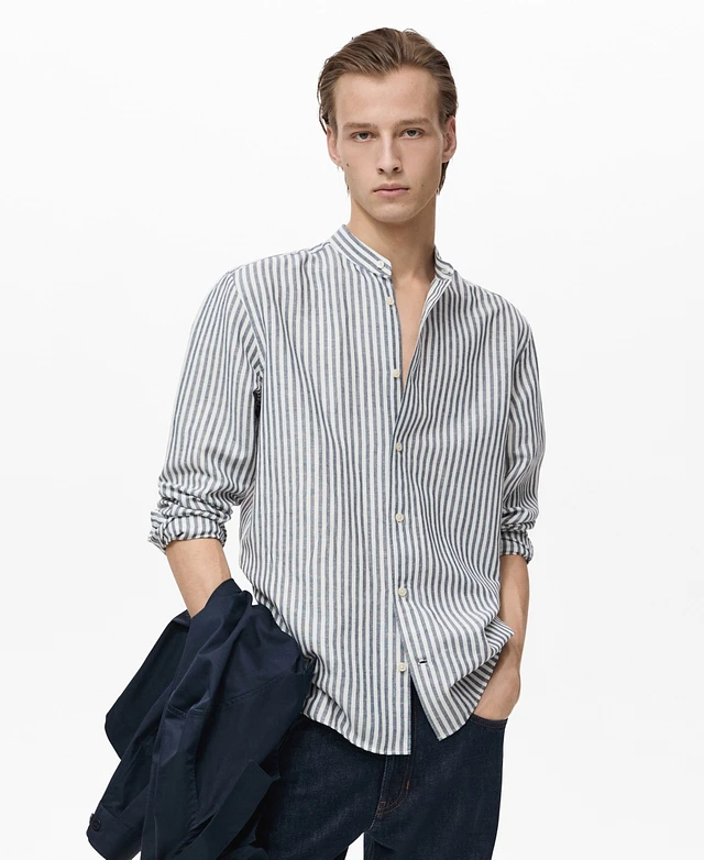 Mango Men's Striped Mandarin-Collar Linen Shirt