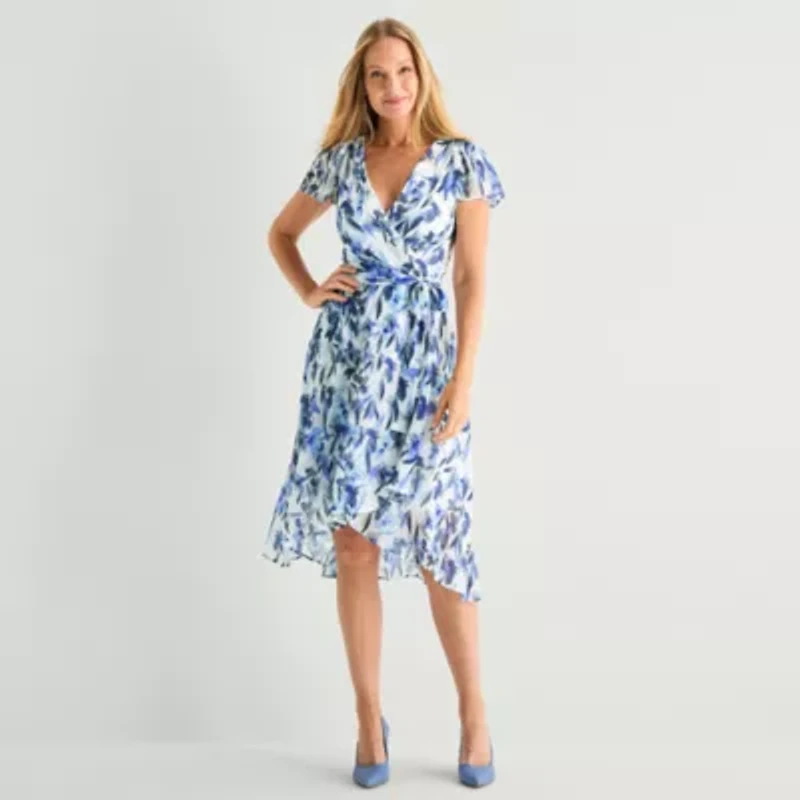 Featuring a beautiful blue and white floral pattern, this Marc New York women's fit and flare dress is a chic, versatile number to have on hand for events and dressier occasions. Made from chiffon, this floaty midi dress has a wrap v-neckline with a waist tie, short flutter sleeves and a high low skirt length. Wear it with pumps and stud earrings.