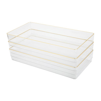 Thoughtful, functional storage is at your fingertips with this 6 pack of 12" x 3" Martha Stewart Kerry stackable organizers. Clear, bpa-free plastic bins are elevated by beautiful gold trim and can be configured on demand for a custom fit in a drawer or on top of your work surface. Recessed bottoms allow the components to slide from side to side for quick access and stack vertically making them an ideal storage solution for small spaces. Non-slip feet ensure these organizer trays stay where you put them and the sophisticated, versatile design multitasks in countless other living spaces requiring tidy, clutter-free surfaces.