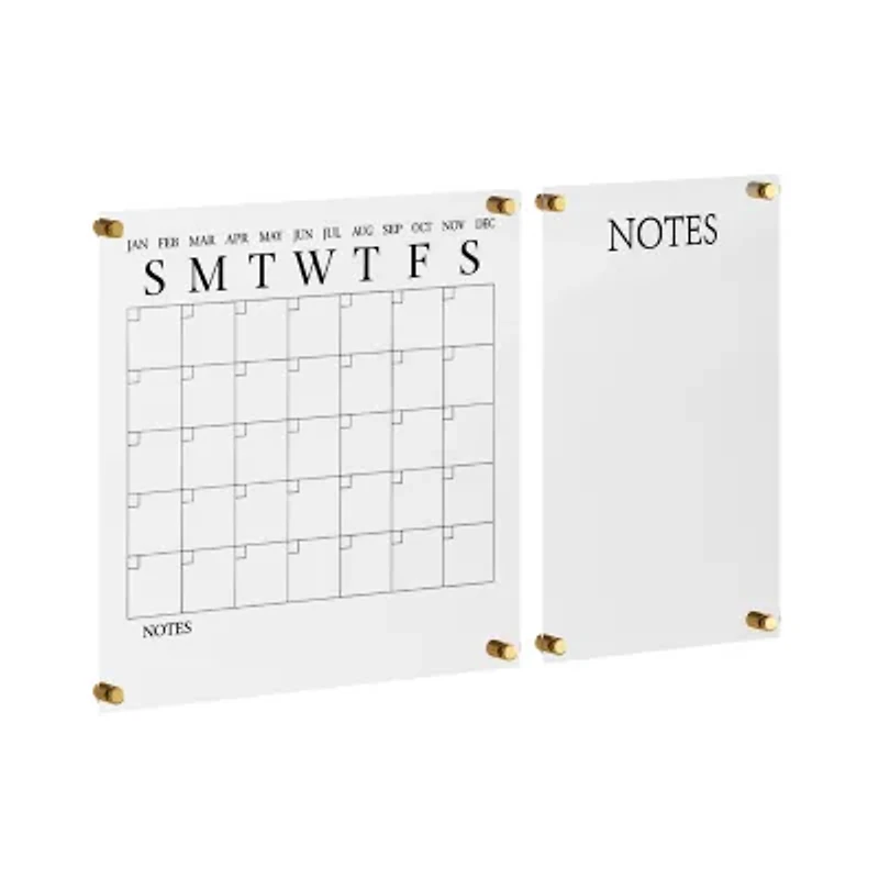 Organize your life and your desktop with the Martha Stewart acrylic monthly wall mounted calendar and notes board set. The polished edges eliminate the need for a frame while the included mounting hardware gives a dimensional appearance for a chic statement anywhere in your home. Comprised of premium crystal-clear acrylic for enhanced strength and overall brightness, this wall organization set is scratch-resistant and waterproof for long-lasting use. Supplemented with a monthly blocked calendar available in 2 printed colors and a dry erase marker for adding important dates that can be wiped clean with a dry cloth and repopulated at the start of each new month.