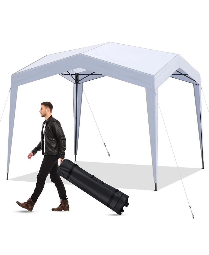 Enjoy dependable shade anywhere with this 10' x 10' pop-up canopy tent. The polyester canopy with silver coating provides UPF50+ sun protection and resists fading, tearing and light rain. A simple pop-up frame allows tool-free setup, while secure corner locks, 4 wind ropes and 8 ground stakes help keep it stable outdoors. Measuring 10 x 10 x 8.7–9 ft with adjustable height, it offers generous coverage for BBQs, beach days and camping. Folds into the included wheeled carry bag for easy transport and storage.