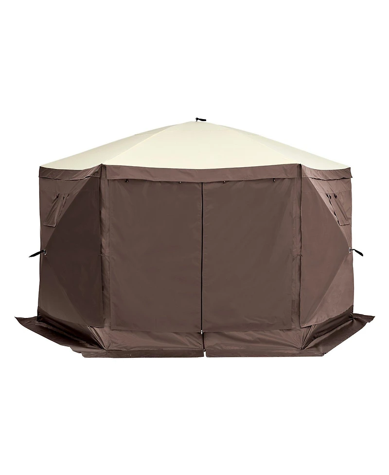 Create a generous outdoor shelter for up to eight guests with this 12.5x12.5 ft pop up gazebo tent in a versatile brown finish. Six mesh-screened panels keep insects at bay while removable wind cloths add privacy and protection from gusts. The 300D Oxford fabric top resists rain and Uv while the fiberglass frame provides sturdy support that stands up to breezy conditions. Tool-free pop-up assembly takes just minutes, and the lightweight construction means one person can carry it from the car to the site without help.