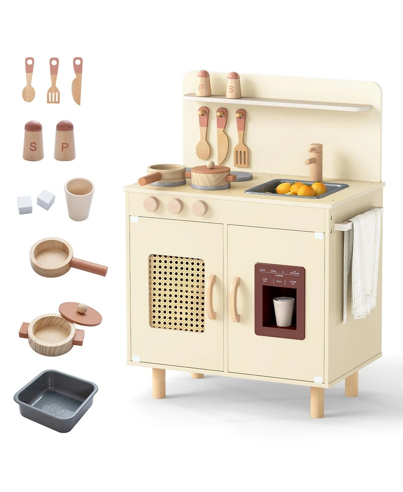 Inspire budding chefs with this feature-rich play kitchen for ages 3+. Kids can ""wash"" veggies in the sink, cook on the stovetop with turnable knobs, and enjoy extra realism with a working ice maker that dispenses ice cubes. Includes a full accessory set-stew pot, frying pan, play knife, seasoning bottles, and more-so kids can copy real kitchen routines. A spice rack, towel rack, and storage areas make cleanup part of the fun. Built from sturdy wood with rounded corners for safer play and long-lasting use.
