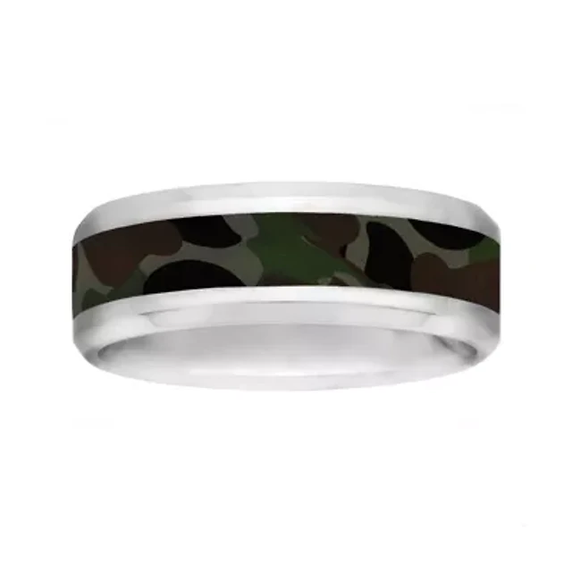 Mens 8mm Comfort Fit Stainless Steel Green Camouflage Wedding Band