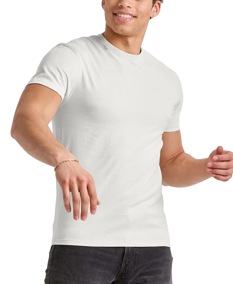 Tried and true, this classic men's T-shirt showcases the best of Hanes quality A ribbed crewneck collar and robust double-needle stitched armholes make it the perfect go-to T-shirt. Crafted from a knit blend that features polyester fibers, this classic T-shirt delivers lightweight softness for a buttery feel you'll love. Gym, track, or rest day - Hanes Originals has your back. Layer this lightweight T-shirt under your favorite hoodie or wear it alone for easy styling.
