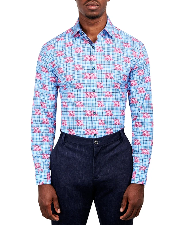 Men's Slim Fit Non-Iron Floral Check-Print Performance Stretch Dress Shirt