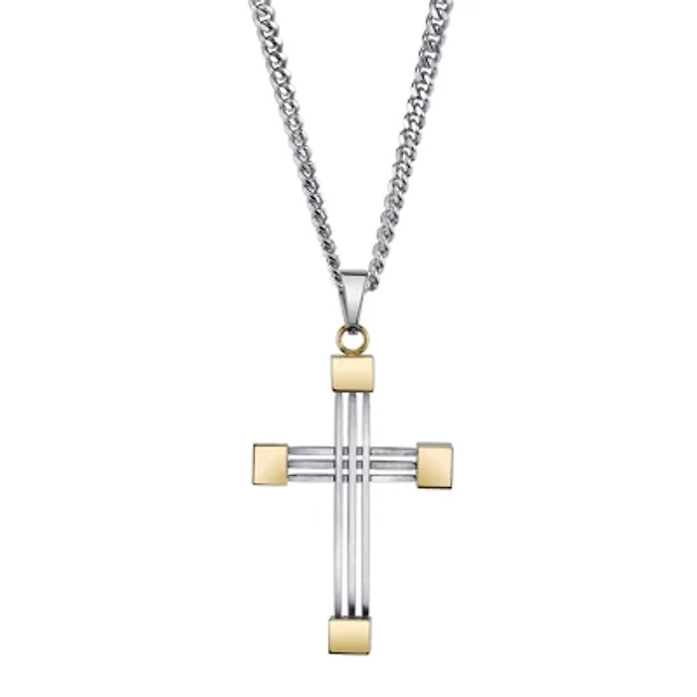 Mens Stainless Steel and Yellow IP Cross Pendant Necklace