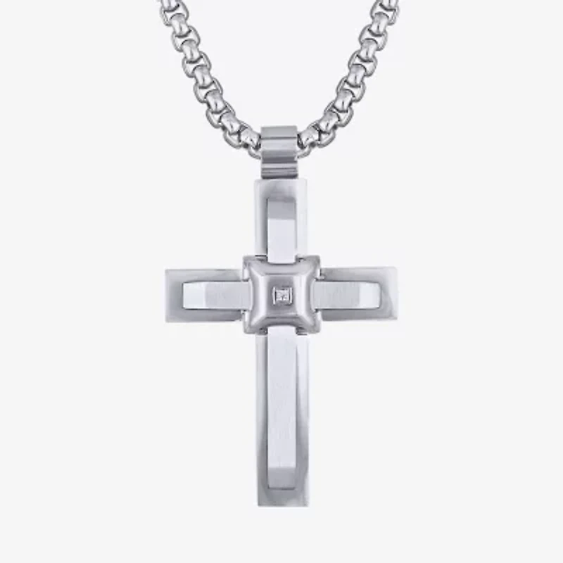 Mens White Cubic Zirconia Stainless Steel Cross 24 Inch Pendant Necklace