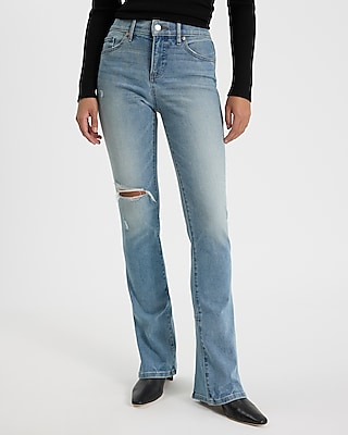 Mid Rise Light Wash Raw Hem Bootcut Jeans