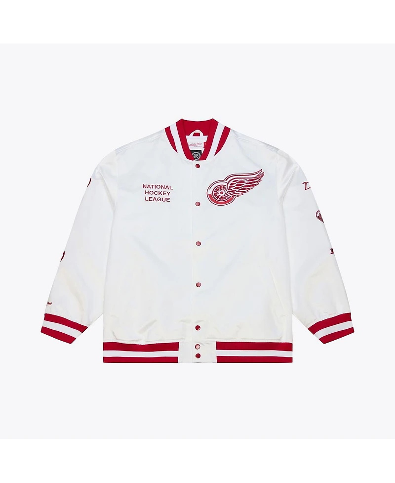Stay frosty and rep your Detroit Red Wings all season long with this lightweight full-snap jacket. Designed by Mitchell & Ness, it features an eye-catching arctic white colorway and embroidered team graphics for a bold look perfect for game days. This jacket is finished with a luxurious satin fabric and rib-knit trims for premium comfort and elevated style while cheering on the Detroit Red Wings.