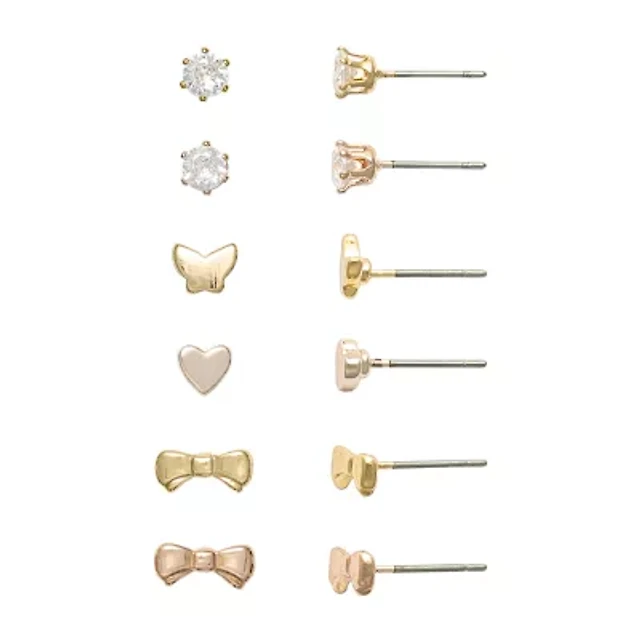 Mixit Womens Cubic Zirconia Bow Butterfly Heart Hypoallergenic 6 Pair Earring Set