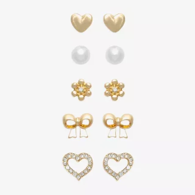 Mixit Womens Cubic Zirconia Simulated Pearl Bow Flower Heart Hypoallergenic 5 Pair Earring Set