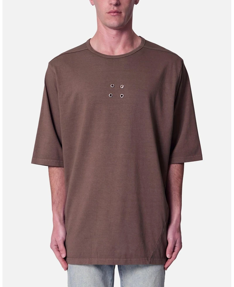 Elevate your fits' with the 4 Eyelets Tee by Mnml. This tee features a flat hem line and an extended sleeve length for an oversized fit, four metal eyelets in the chest, and is finished in a garment washed cotton fabric.