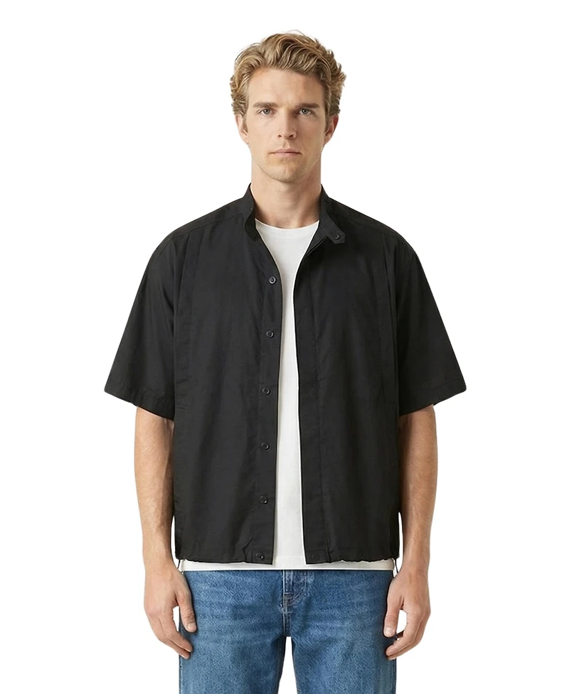 This short sleeve jacket features a sleek stand collar and a clean hidden front closure for a modern, streamlined look. Designed with a structured yet lightweight feel, it offers a refined silhouette that balances minimalism with subtle utility. Adjustable side drawstrings provide a customizable fit, adding both function and shape. Pair it with tailored trousers or relaxed bottoms for a versatile piece that elevates everyday styling.