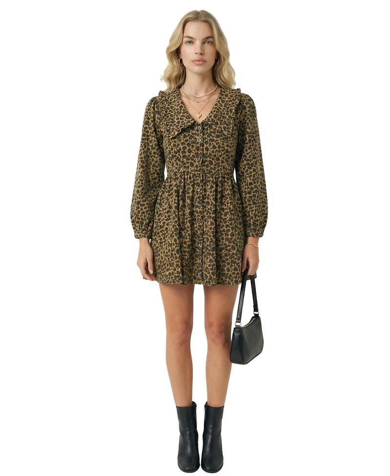 A bold leopard print lends statement-making appeal to this long sleeve mini dress, designed with an oversized notched collar and a flattering fit-and-flare silhouette. The button-front closure and gathered waist create a feminine shape, while discreet side pockets add practical charm. Crafted from a soft, structured woven fabric, this dress transitions effortlessly from casual to elevated looks with a simple change of footwear.
