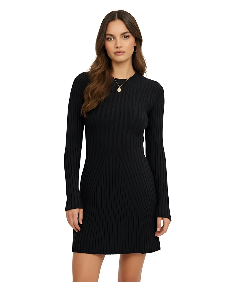 This fitted sweater dress is crafted from a soft, stretchy ribbed knit that contours the body and moves effortlessly with you. The long sleeves and crew neckline offer a sleek, balanced look, while diagonal rib detailing at the hips adds dimension and shape. A subtle flared hem creates a flattering silhouette that's easy to dress up or down.