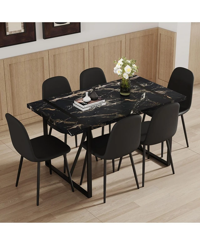 Modern Dining Set with 6 Upholstered Chairs, 55"x31.4" Black Marble Pattern