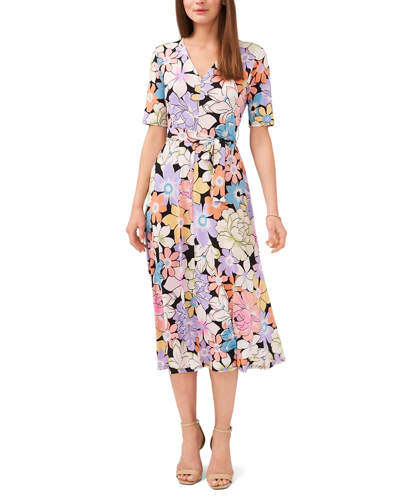Springtime blooms with every step when you wear Msk's floral-print dress, a flattering midi silhouette that cinches at the waist with a self tie.